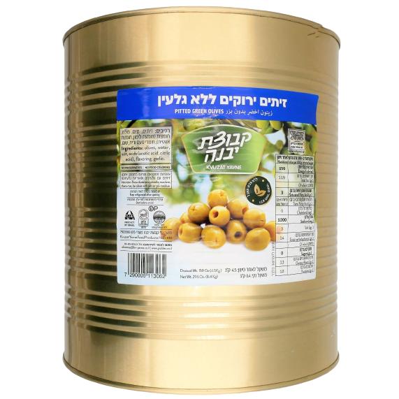 PREMIUM KOSHER GREEN PITTED OLIVES KY 8.4 KG. PERFECT FOR CATERING, RESTAURANTS, AND BULK USE. FRESH TASTE, CERTIFIED KOSHER.